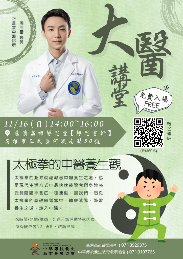 太極拳的起源就蘊藏著中醫養生之道,也是現代生活方式中最快速能讓我們身體感受到陰陽平衡的一種運動💪這次邀請到周弓量醫師帶領大家一起從太極拳的基礎練習當中,體會陰陽,學習養生之道,走入中醫吧‼️🔸時間: 11/16(日)14:00~16:00 (13:30開始入場)🔸地點: 慈濟高雄靜思堂【靜思書軒】(高雄市三民區河堤南路5諄報名連結🔗 https://forms.gle/kJiZGswxUKRbakiq6※免費入場 名額有限 歡迎踴躍報名※