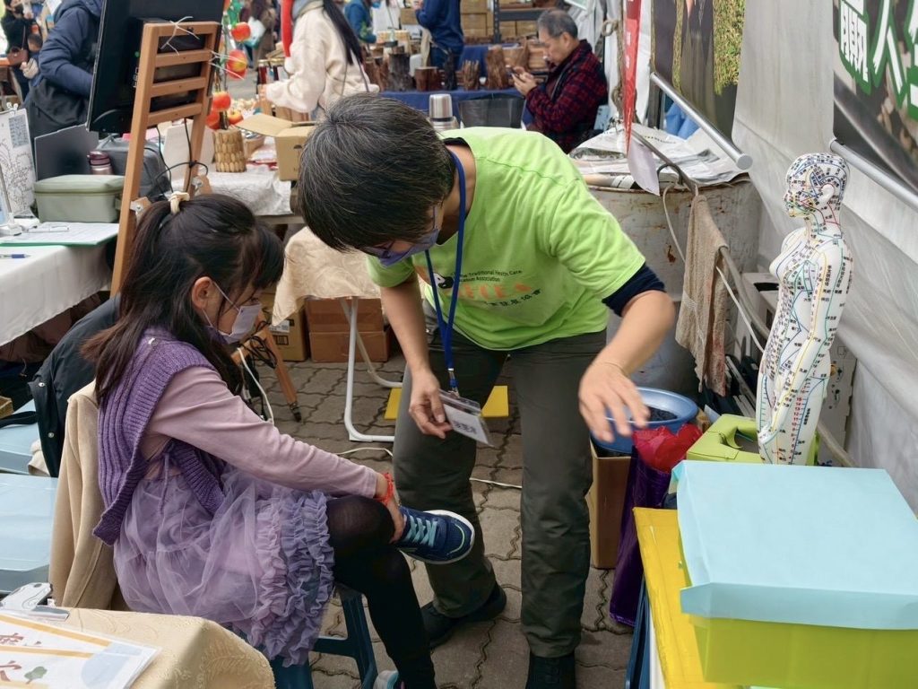 一位奶奶帶著因苦於便秘而淚眼婆娑的孫女,來到攤位,小小中醫班欽仁老師初步先按摩合谷,支溝穴緩解便秘不適,接著轉給郭醫師診察。郭醫師以承山配偏歷按摩,承山是便秘要穴,偏歷通調水道,一會兒腹痛消失,郭醫師要小孫女等有便意可以再去上廁所。於是小朋友安心的跟奶奶一起參加朝禮法會。
