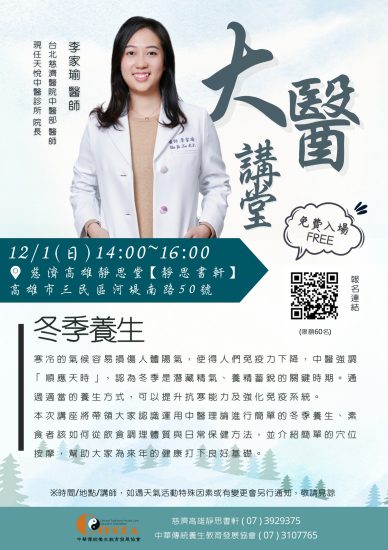 本次講座將由李家瑜醫師帶大家運用中醫理論進行簡單的冬季養生、素食者該如何從飲食調理體質與日常保健方法,並介紹簡單的穴位按摩,幫助大家為來年的健康打下良好基礎